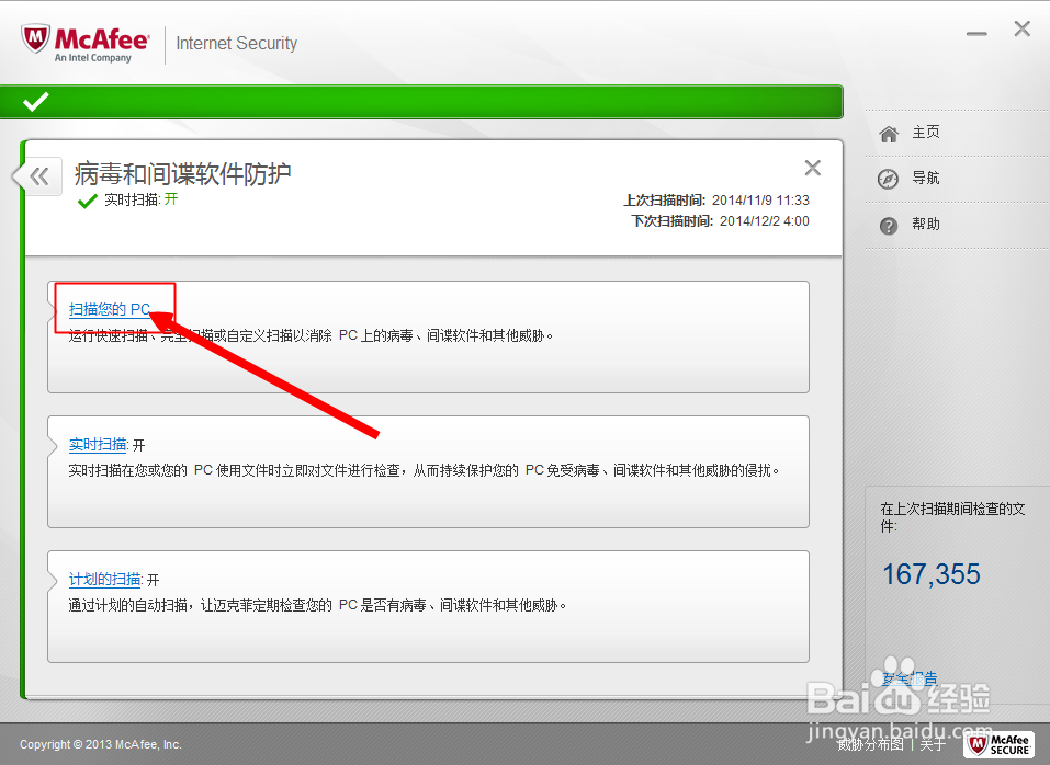 进入迈克菲后,点击“病毒和间谍软件防护”,如何想扫描电脑,点击“扫描您的pc”就可以扫描病毒
