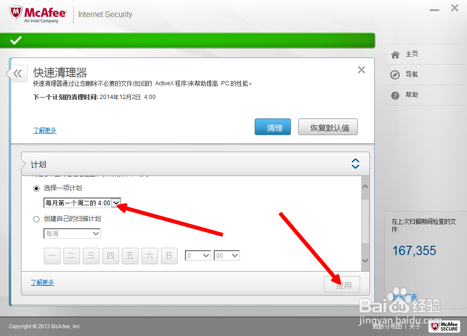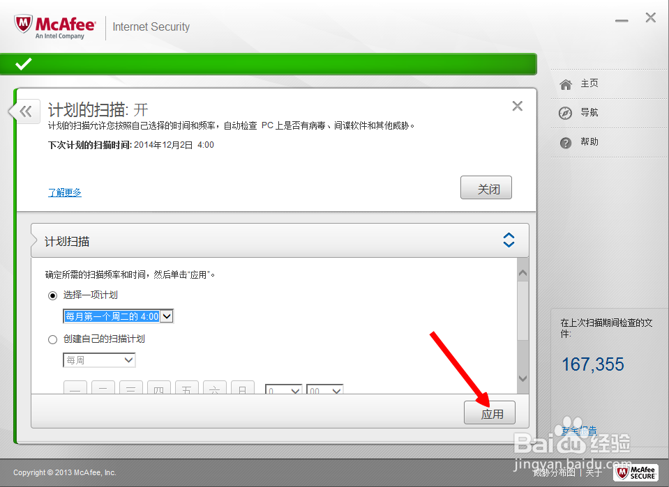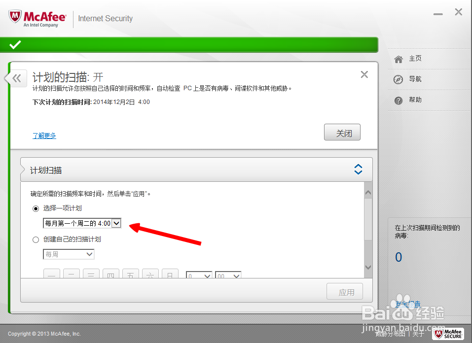 点击“计划的扫描”,选择合适自己的计划,一个星期扫描一次或者一个月都可以,选择好后,点击“应用”,定时扫描就完成了