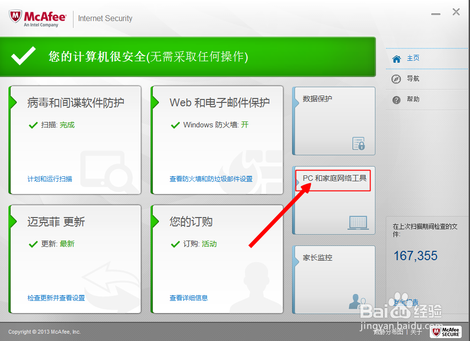 作为杀毒软件,迈克菲还能够自动清理不必要的文件,提高电脑性能,点击“pc和家庭网络工具”