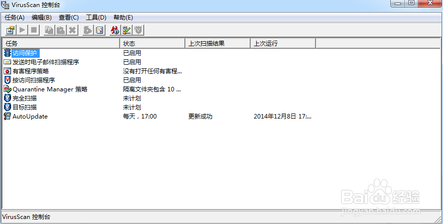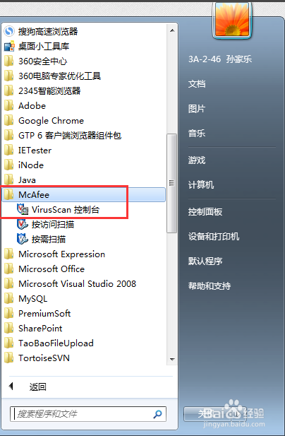 打开我的电脑图标,点击“所有程序”按钮,找到Mcafee文件夹,打开“VirusScan控制台”如下图所示 。