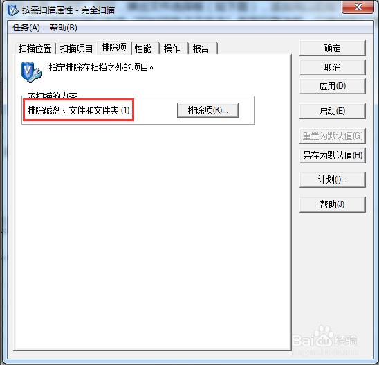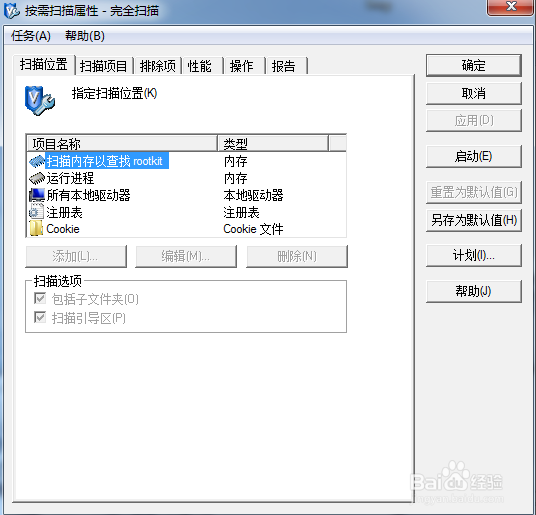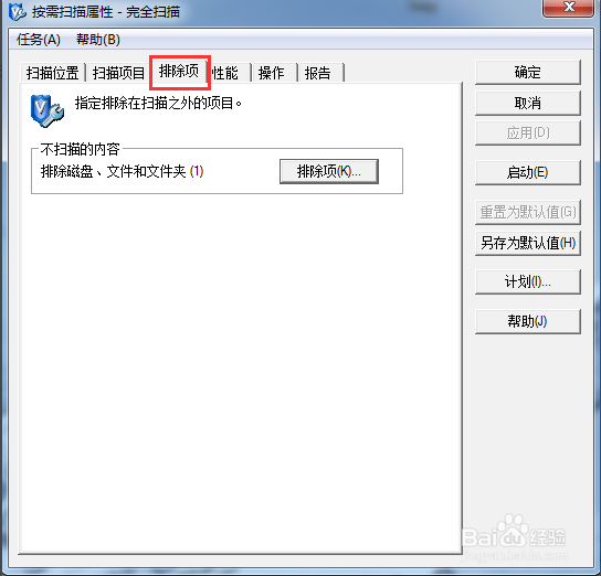 选中“完全扫描”项,点击鼠标右键,弹出选择框,选择“属性”项,弹出属性对话框(如下图所示)