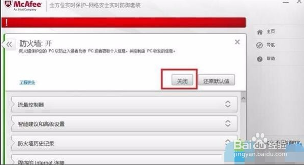 这个很简答了如图所示,打开迈克菲,点击【导航】-【防火墙】,点击【关闭】按钮;