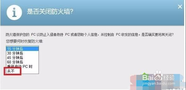 点击了以上的步骤的话会出现提示,此时会弹出提示框,我们选择【从不】-【确定】,防止其自动开启;