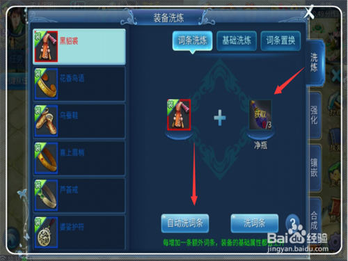 1.装备洗练怎么做:点击游戏界面,然后再右上角的“+”点击出现下列,第一列就是装备强化,点击进入,首页是洗练,需要净瓶来进行洗练属性,不同颜色需要的净瓶种类和数量也不同。