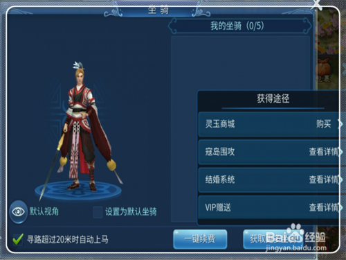 2.坐骑获取方法:坐骑获取有三种方法:第一种土豪版的-商城购买;第二种帮派任务-周日任务-随机奖励战马;第三种婚姻奖励-结婚坐骑3天;