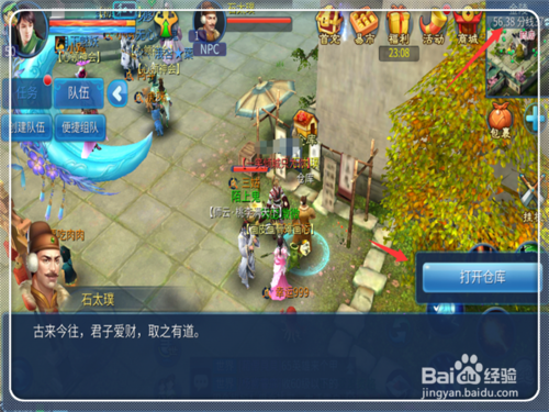 5.仓库地点寻找:网游的仓库一般来说很好找,但是手游很多人都不熟悉,所以有点麻烦;执行方法:在一条龙任务npc下侧的石太噗,就是仓库npc(56,38分线37)