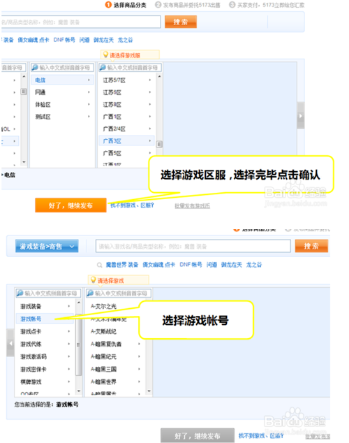 5、选择要出售的游戏账号、选择区服,选择完毕点击确认。