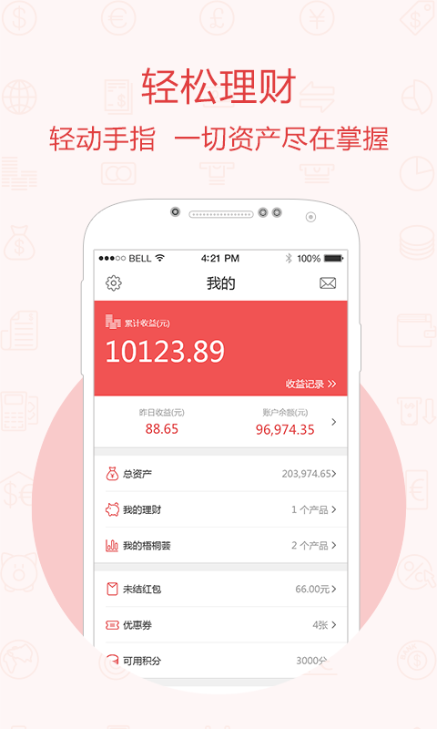 梧桐理财app是一个颠覆传统的互联网精品理财平台。梧桐理财app通过精选优质基础资产,严格风险控制,多资产配置组合,为互联网投资人创业低门槛,高收益,灵活变现,安全稳健的互联网理财方式;率先创新非标金融资产的质押融资模式,研发出第一款针对券商非标资产的融资产品、第一款地产基金贷、第一款私募基金贷等多个领先行业的创新产品;梧桐理财app荣获千万A轮融资,将为您提供更优质的理财服务,真正实现人人赚更多!