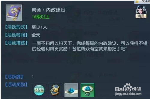 奖励:经验、帮会帮贡、帮会资金、精力值