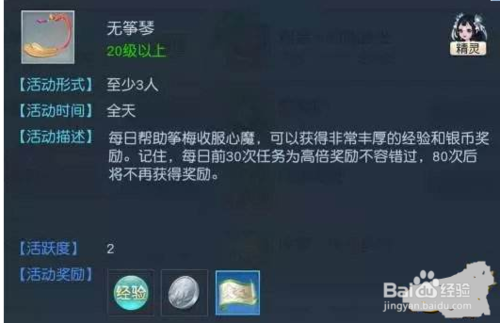天命者到达20级后,可在右上角的“活动”处领取“无筝琴”任务。活动为全天候开放,前30次为高倍奖励。推介完成前30次即可。奖励为经验、银币和藏宝图。