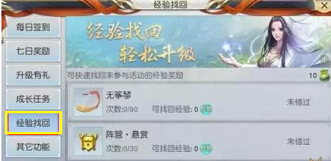 PS:经验找回的活动有次数限制,且需要消耗物品“袋中天”。“袋中天”可在灵玉商店购买。