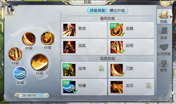 点击主界面右侧的“技能”按钮,可以查看技能相关信息,包括技能“图标”“等级”“历练数量”“流派”“生活技能”等等信息;