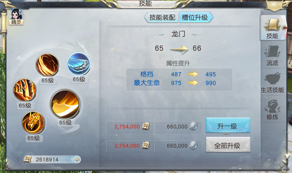 对每一个技能槽位进行升级,可以在该界面右侧看到该技能槽位提供的属性提升,升级需要的“历练数量”“银币”等等信息;点击“升一级”按钮仅对当前选择技能槽位进行升级,点击“全部升级”对所有槽位的技能进行统一升级;