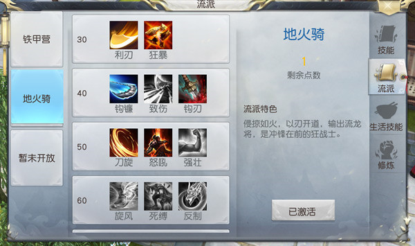 每个职业都会有多种不同的流派,每个流派都有自己专属的技能,代表了一种新的玩法。例如龙将目前开放的两个流派铁甲营和地火骑分别对应了流和输出流的龙将,切换流派的时候只需要点击“激活”按钮即可;