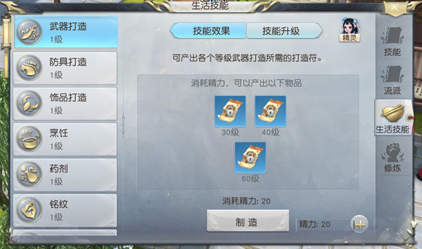 除了职业战斗技能外,还有通用的生活技能。其中包括武器打造、防具打造、饰品打造、烹饪、药剂等多个不同的生活技能,包含了属性提升、血量回复、铭纹强化多个不同的效果;