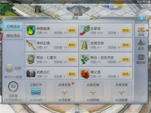 30级以后,将逐渐解锁更多日常任务,大部分都可挂机完成。奖励除了经验外,部分活动还有稀有道具奖励!