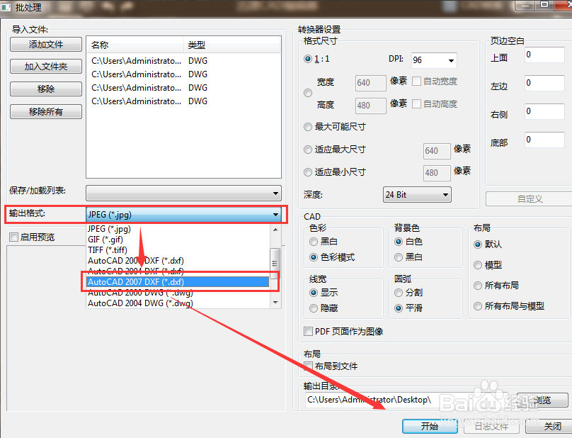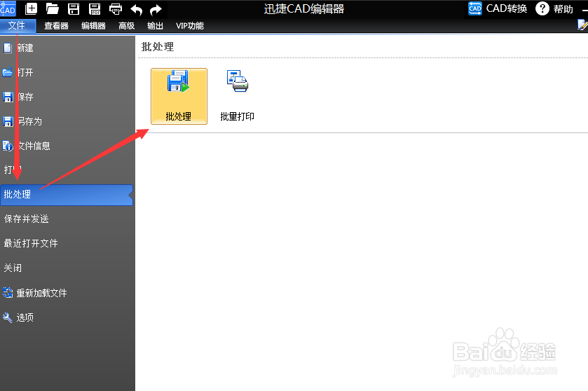 4、CAD文件的版本不用多说,有很多种,一般是高版本转换成低版本,文件的常用格式有DWG、DXF、PDF、CAD、JPG等,转换可以按照一下操作。再次点击左上角文件二字,打开批处理。