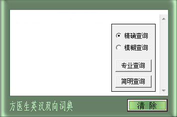 方医生英汉双向词典方便、快速、准确的双向查询,根据需要选用“专业级查询”“简明方式查询”“精确查询”及“模糊查询”,所有操作均在一个文本框中进行,不必变换窗口,力争最大限度减少操作步骤,缩短查询时间。