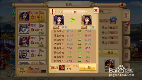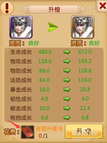 游戏中的将领分为绿将、紫将和橙将三种武将,其中绿将最差,橙将最好。无论是属性还是其他方面橙将都比其他将好,所有我们在提示武将战力时优先提示期品质,使用特殊用品升橙书来把武将升橙。其中升橙书可以在充值中获得,也可以在商店中用天书残页兑换。
