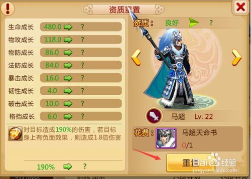 将领有个资质这一说,资质也决定了一个将领的上限,资质分为良好、优秀、卓越、完美,其中我们所获得的将领基本都是良好品质,这个时候我们要想提升战力就要重新刷新我们的将领资质了,最好的资质就是完美,尔最好的完美就是属性全紫的完美,我们可以使用其对应的天命书来对其进行重置,直到刷出完美。