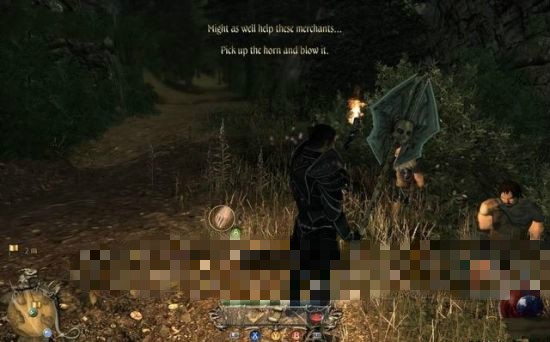 主角从草丛里拾起号角,吹响了它,然后上前给三名商人松梆。