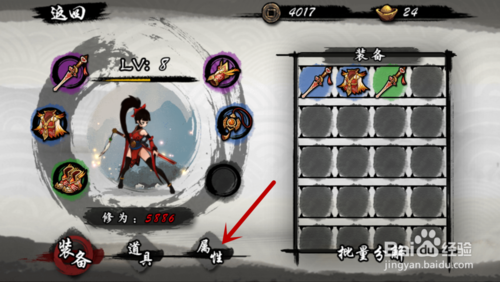 之后我们进入到自己角色信息和基本操作界面,我们点击下面的“属性”功能选项,如图所示。