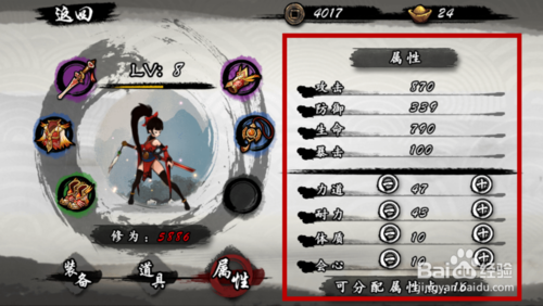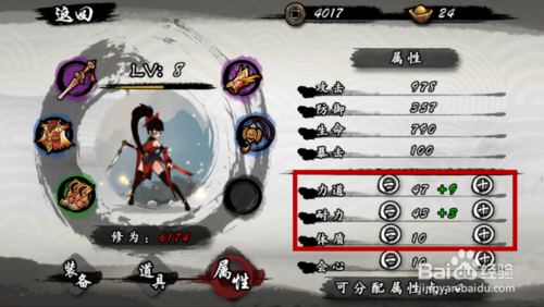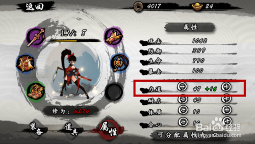 最后还有一种稳妥的加法,就是每加3点力道,就加1点耐力或体质,注意耐力和体质我们不要全加,选择一个即可。这样我们在保证攻击力的时候,防御力或是生命可以让我们避免失败,防御住怪物的攻击,但是这种加法只对于操作不是很好的玩家比较适合,如图所示。