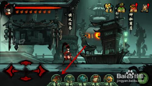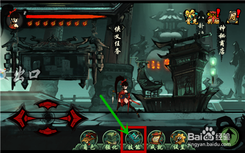 如图。打开游戏,进入游戏主界面(秘境),之后点击技能。