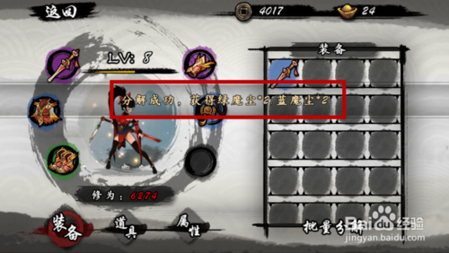 之后即可将装备分解成功,并弹出分解成功的提示和获得的奖励,装备就消失啦,如图所示。