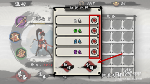 之后在弹出的选项中,选择我们要分解装备的品级,我们勾选那个品级的装备,一次性就会全部将其分解。之后我们点击下方的分解,即可分解装备成功,如图所示。