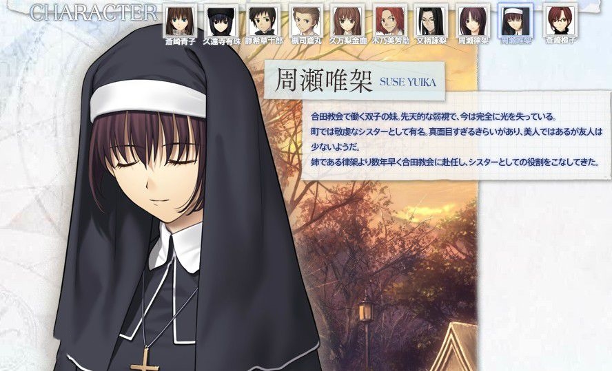 在合田教会工作的双胞胎妹妹,患有先天性的弱视,已经完全失明了。在镇上是出了名的虔诚的修女,性格有点认真过头。虽然是美人但貌似没什么朋友。