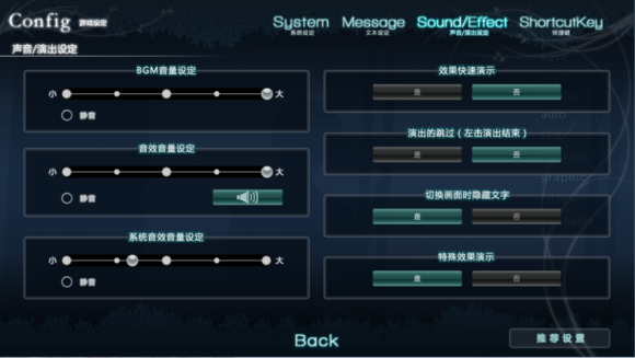 3D音效故事全篇在音效上采用了人头录音,在文字游戏中鲜少有公司使用这种录音方式。此种音效是在录制的时候采用了特殊的录音方式,达到了双声道耳机也能体会7.1声道效果的突破。缺点也是普通音响听不出效果,7.1声道的音响。推荐耳机欣赏。顺便一提,电影院都是7.1声效,当然硬件上也是配合7.1声效的8声道扬声器。