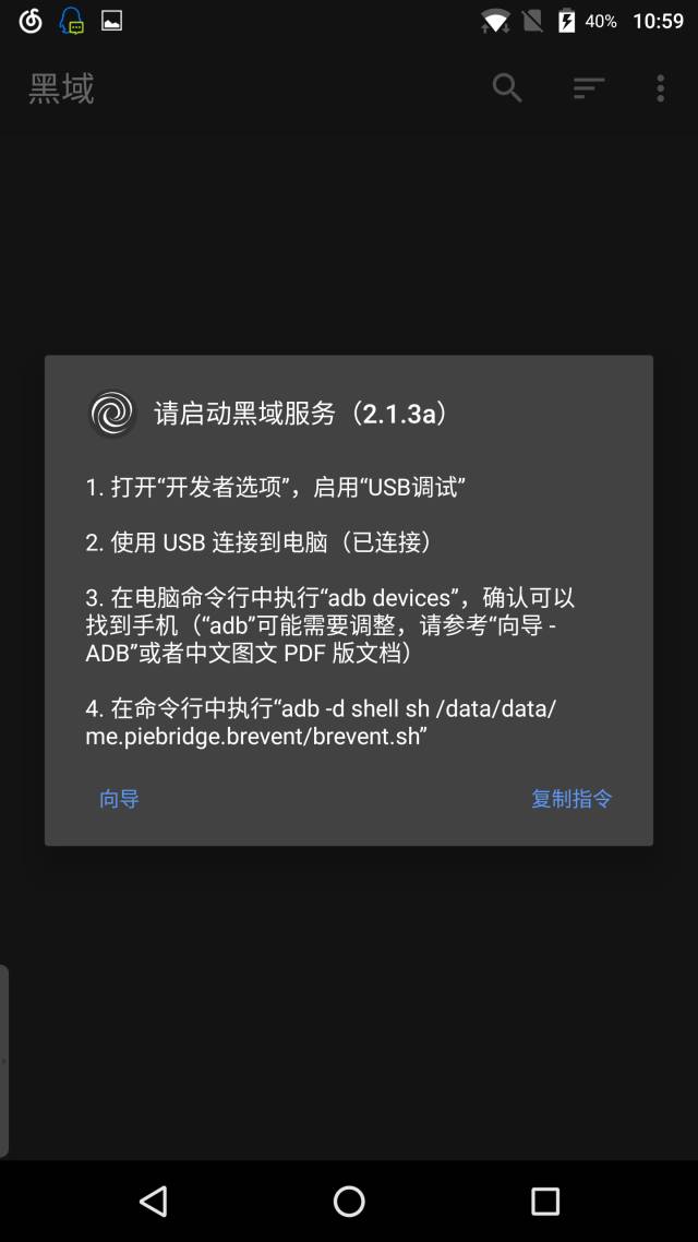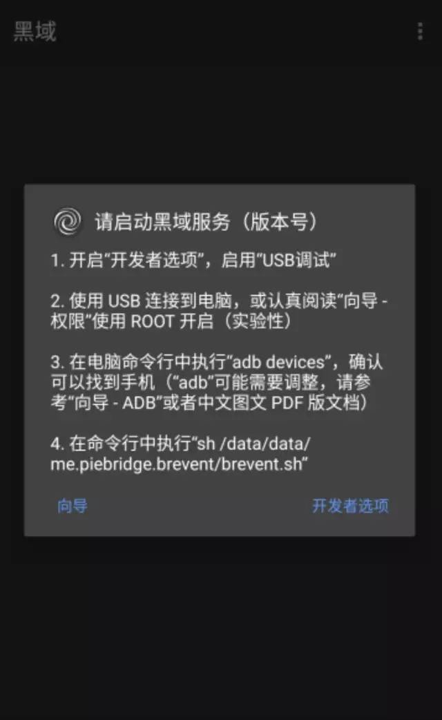 5)/data/data/me.piebridge.brevent/brevent.sh: 指令路径,黑域英文名为brevent (Black Prevent),包名为 me.piebridge.brevent