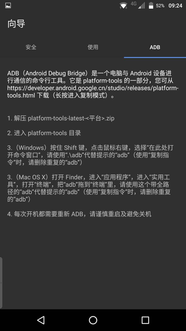 1)adb: 程序名字。Windows 下请在 adb 目录打开命令行窗口,输入 .\adb,Mac OS X 下请输入 adb 全路径