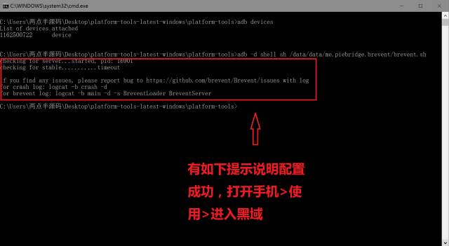 10、复制上面的指令:adb -d shell sh /data/data/me.piebridge.brevent/brevent.sh ,按回车键