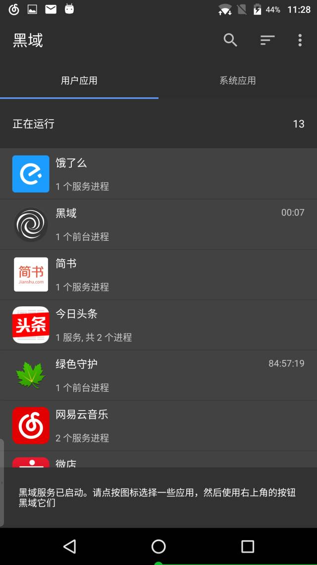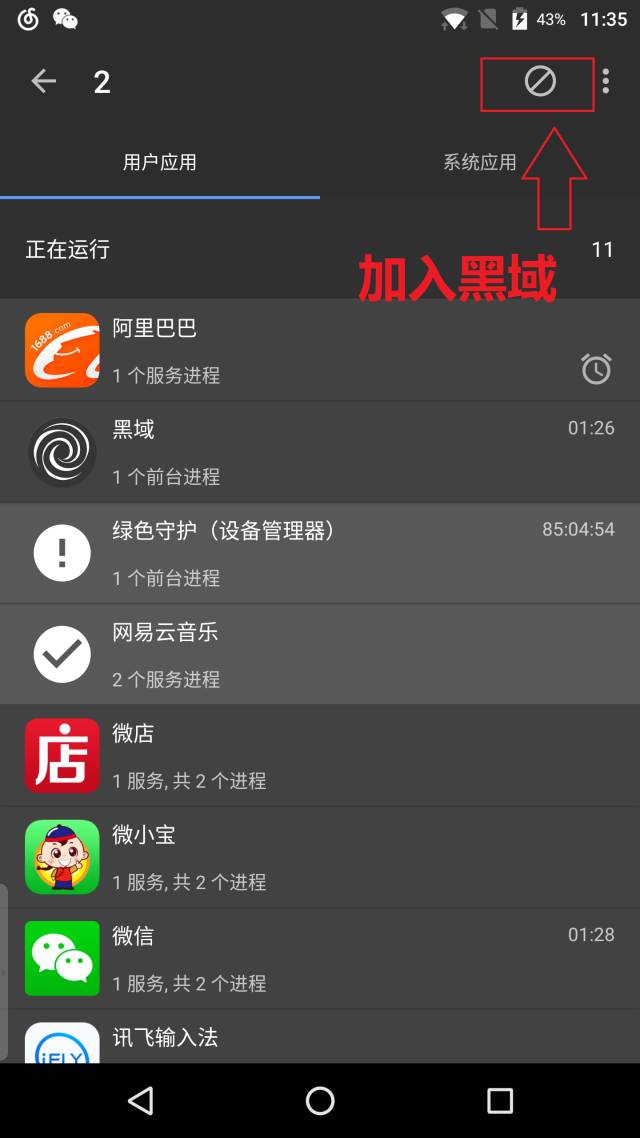 2.待机超时,或者从最近列表划掉它,黑域会强行停止它;