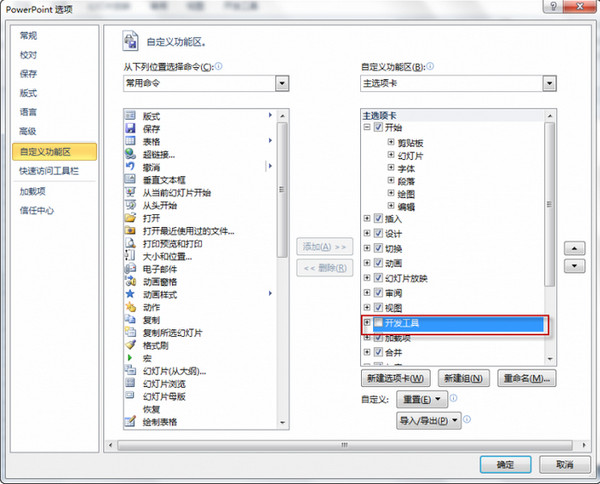“开始”——“选项”——“自定义功能区”——勾选上“开发工具”——“确定”