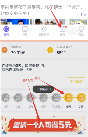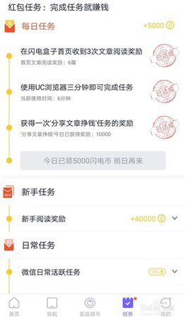 有红包限制的,每天的红包都会无上限,有几分钟可以领取红包等选择,点开该软件下方的“任务”二字,可以显示新手任务,邀请两名徒弟可以有5元的红包,而且还会给你加闪电币,首页阅读是赠与你1000闪电币,这样的诱惑谁还能抵抗住呢,倒计时红包可以有200个闪电币。