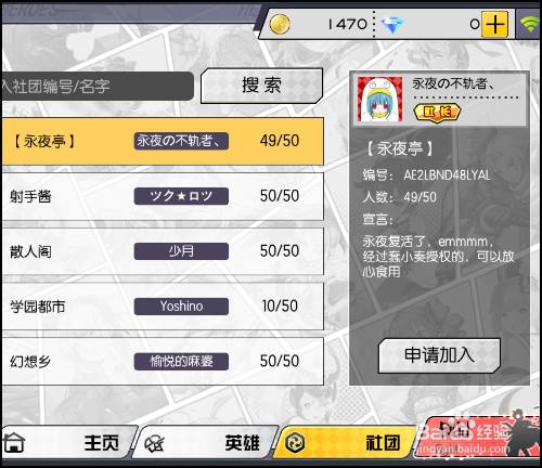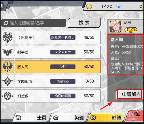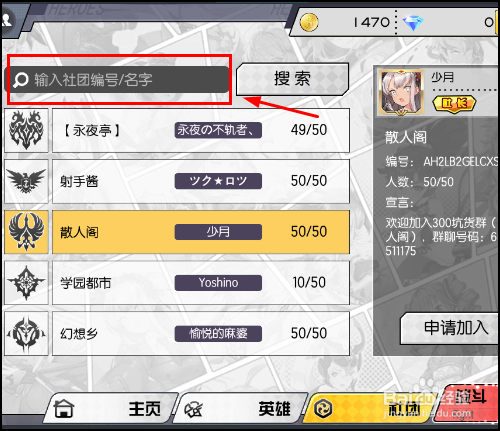 也可在上方搜索社团的名字或者编号,搜索出来后,点击申请加入即可,如图所示