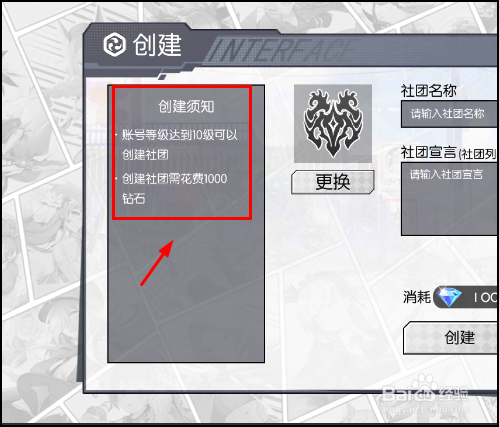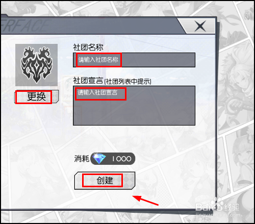 如果前面两个条件满足,就可以创建社团了,更换头像,输入社团名字和宣言,点击创建即可,如图所示