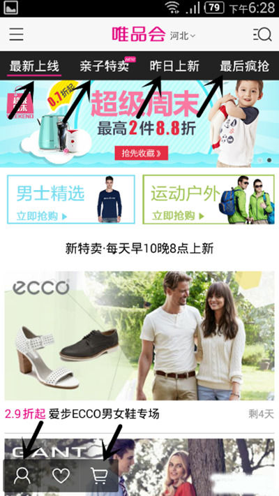 登陆唯品会手机APP后,会直接定位你所在的省份,然后主页上会出现推荐的各类商品的图片和文字,例如:最新上线、亲子特卖、昨日上新、最后疯抢。同时主页上还有购物车标示和我的信息图标。