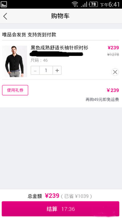 把商品加入购物车后,直接进入到购物车或者回到主页面,点击左下角的购物车标示(唯品会的购物车时间是限时的,一般是20分钟左右,所以需要大家及时付款),进入到购物车付款页面,点击“结算”付款。