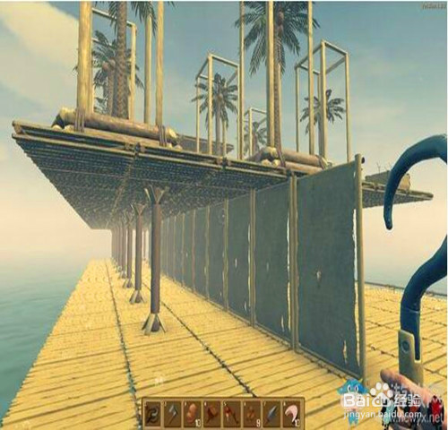 3、后面接下来就是拓展阶段,如果木筏不够宽的话,木筏宽度两格就可以合并成大的木筏 ,一字长蛇阵造收集网,网造的越宽收集东西越快,收集的东西越多。
