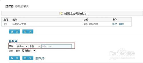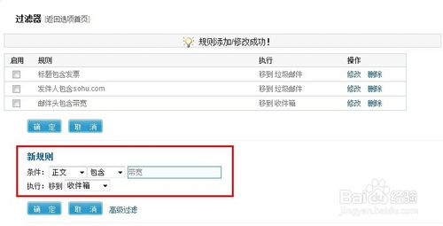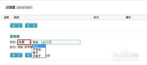 点击过滤器(黑名单),在新规则下面设置条件,有标题,发件人,正文,然后还有包含,不包含,等于,不等于等等条件选项,这个比其他邮箱更加好用。先看下标题,如果邮件标题中含有设置的条件的邮件,即会被过滤掉。