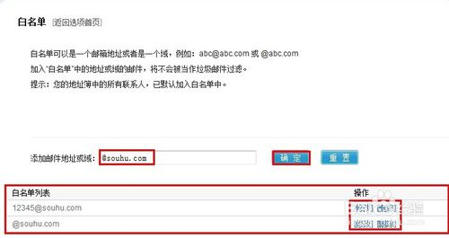 登陆搜狐邮箱,点击菜单栏处的选项,就会看到反垃圾过滤功能,下面有过滤器(黑名单)和白名单设置。
