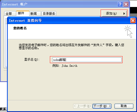 2. 点击“添加”-->“邮件”,在弹出的对话框中填写您给这个账号设置的名称: