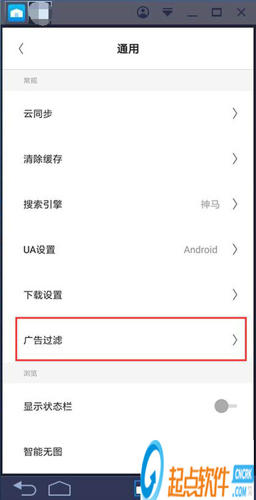 4、之后在弹出来的选项中我们点击“广告过滤”,在里面选择将广告过滤选项,即可过滤我们在使用夸克浏览器时的广告,是按照一定规则过滤的。有些不影响使用的广告还是不能完全的过滤,多数的广告可以去广告。