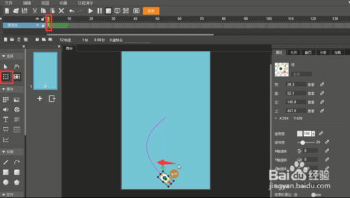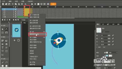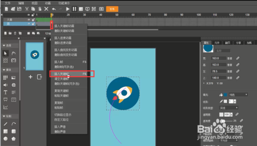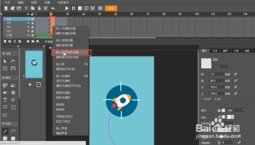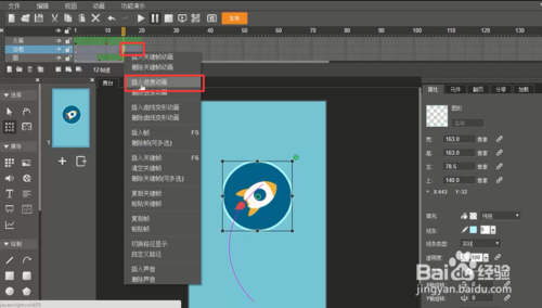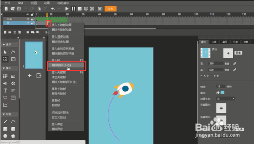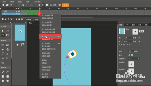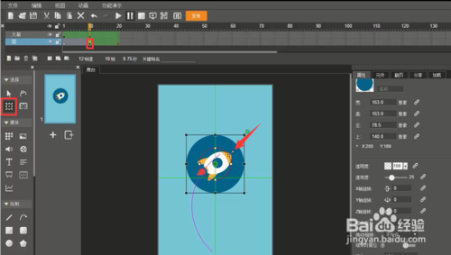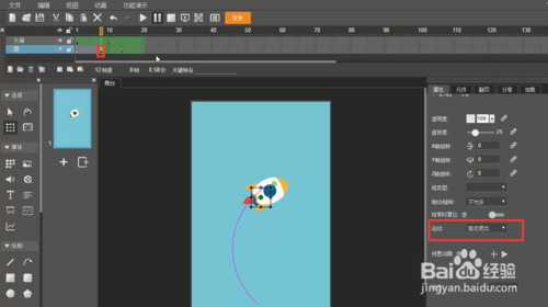在图层第10帧的位置“插入关键帧动画”,设置火箭从底部弯曲滑向上端并放大的动画效果