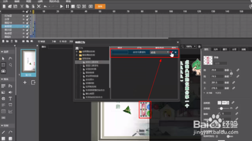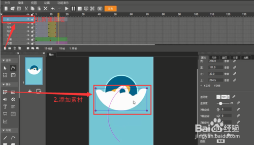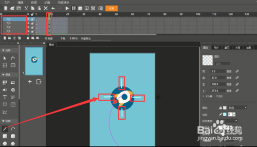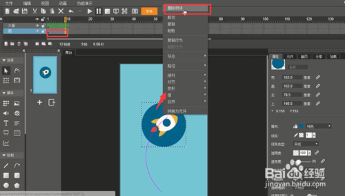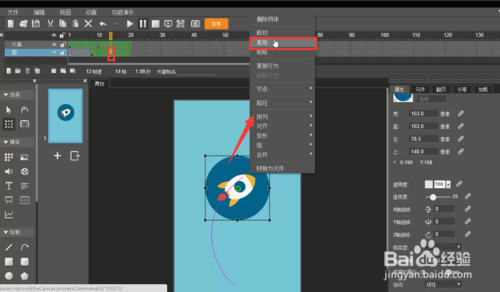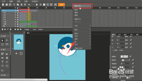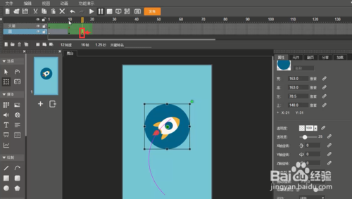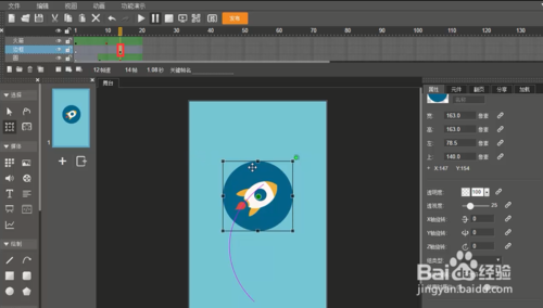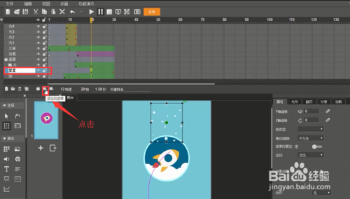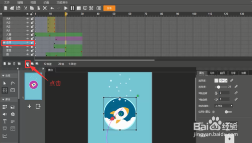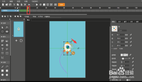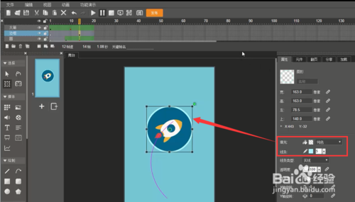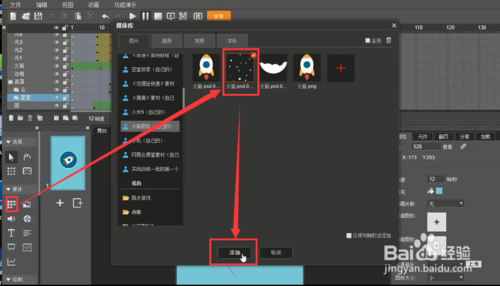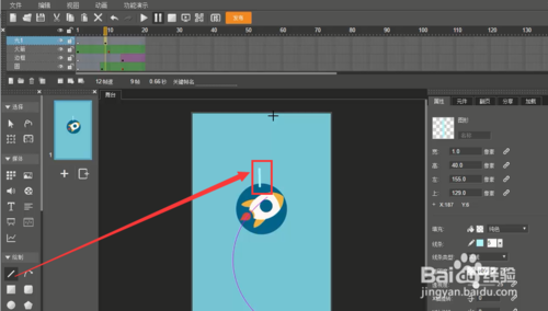 如下图,在“舞台”的“属性”面板下将其填充色调整为浅蓝色,点击“素材库”按钮添加相应的火箭图片素材,调整火箭大小、位置等