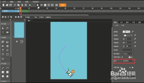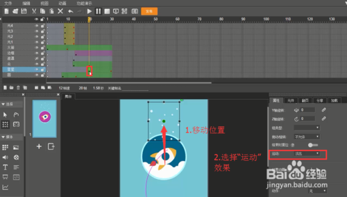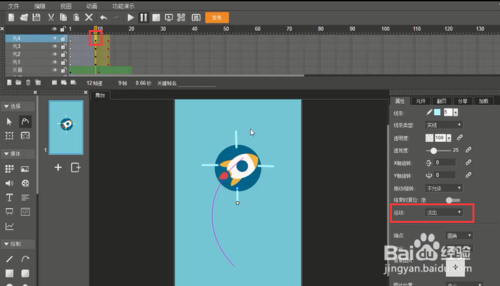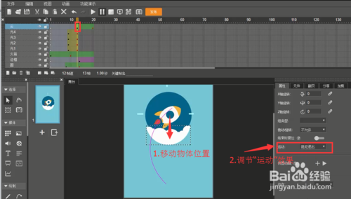 选中第1帧,在其“属性”面板下调整“运动”效果为“阻尼退出”